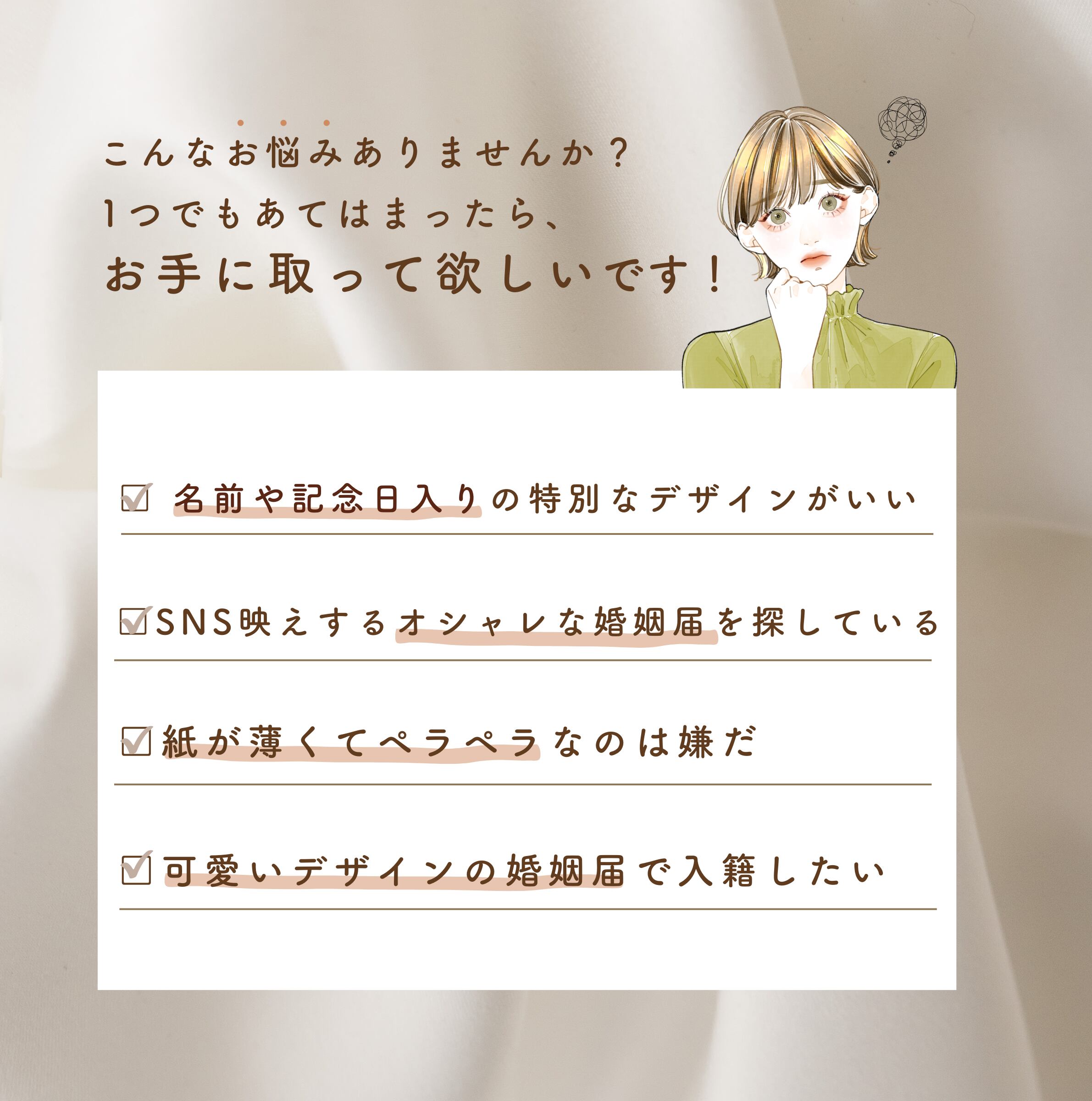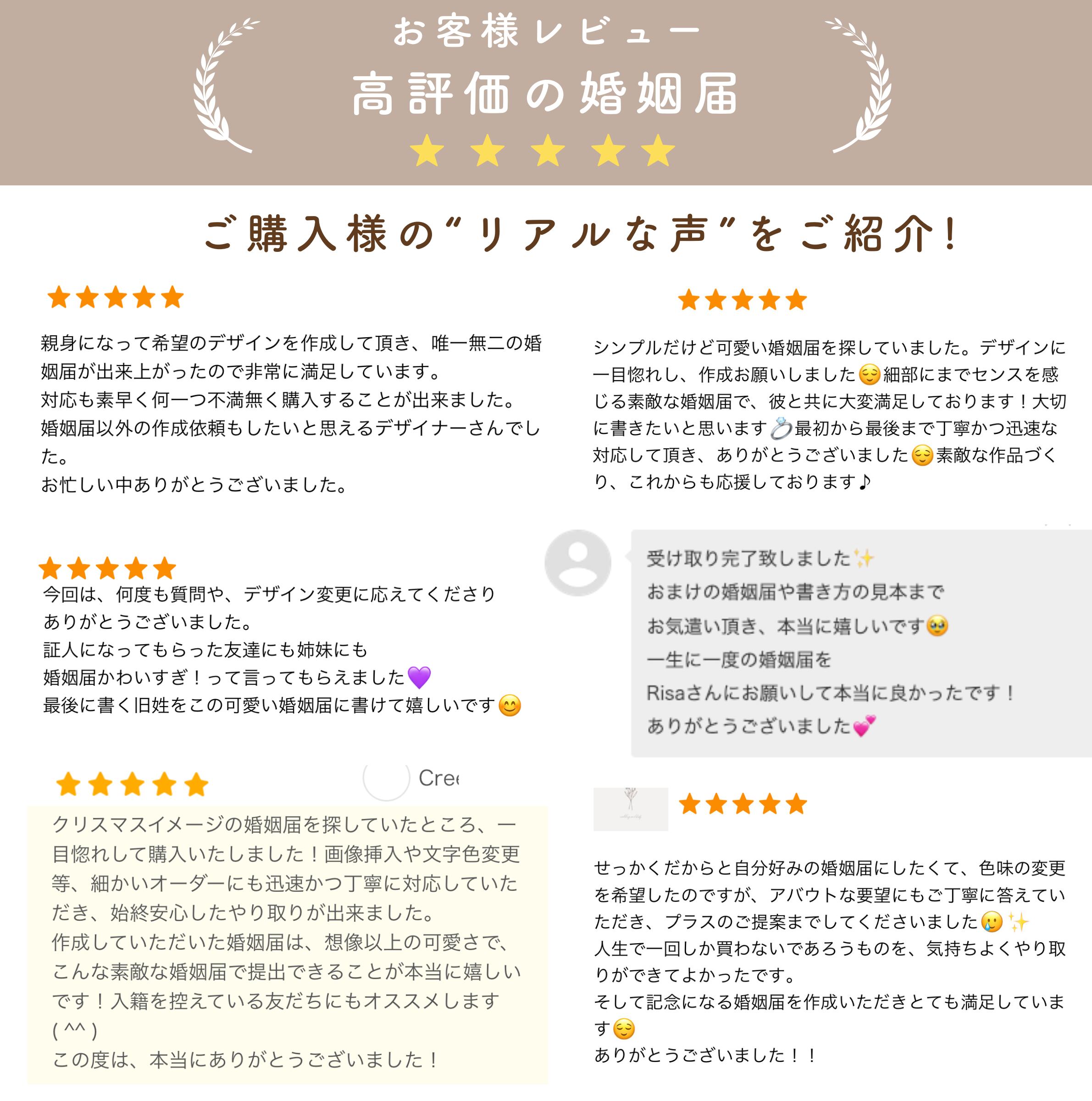 ・「おふたりのお名前」や「ご入籍日」「ご希望のデザイン番号」のご連絡をお忘れないようにお願いします!